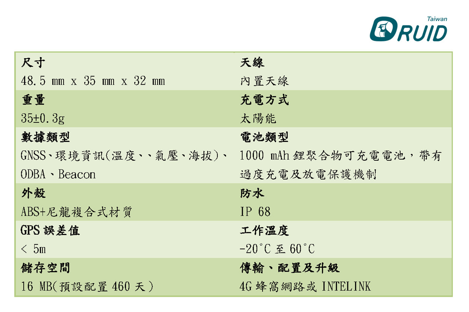 內建電池1000mAh,以太陽能進行充電,適合棲息在光照不足之環境物種。