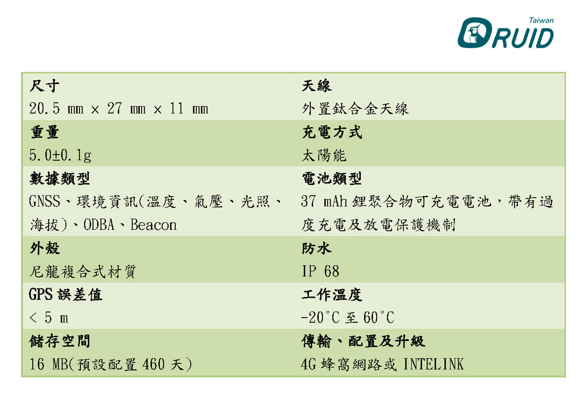尺寸為20.5 × 27 × 11 (mm),重量為5.0±0.1g。